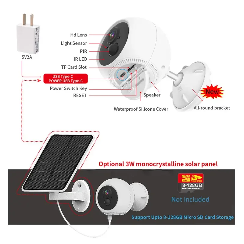 - Камера може заряджатися від мережі 220 В, Power bank і сонячної батареї (сонячна панель не входить в комплект). Це робить її автономною від відключень електроенергії.