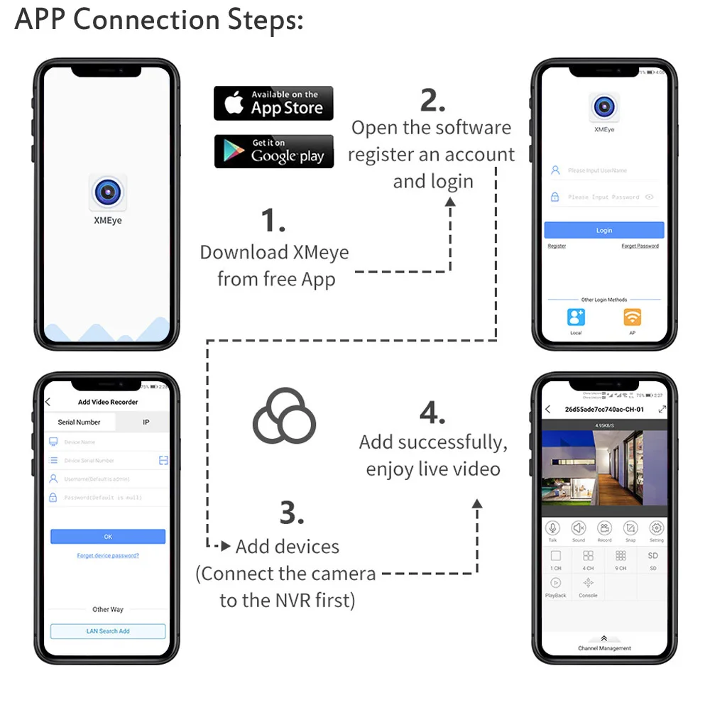 - Управління через додаток XMeye: Зручний додаток XMeye дозволяє віддалено переглядати записи, керувати налаштуваннями та отримувати сповіщення на мобільний телефон.