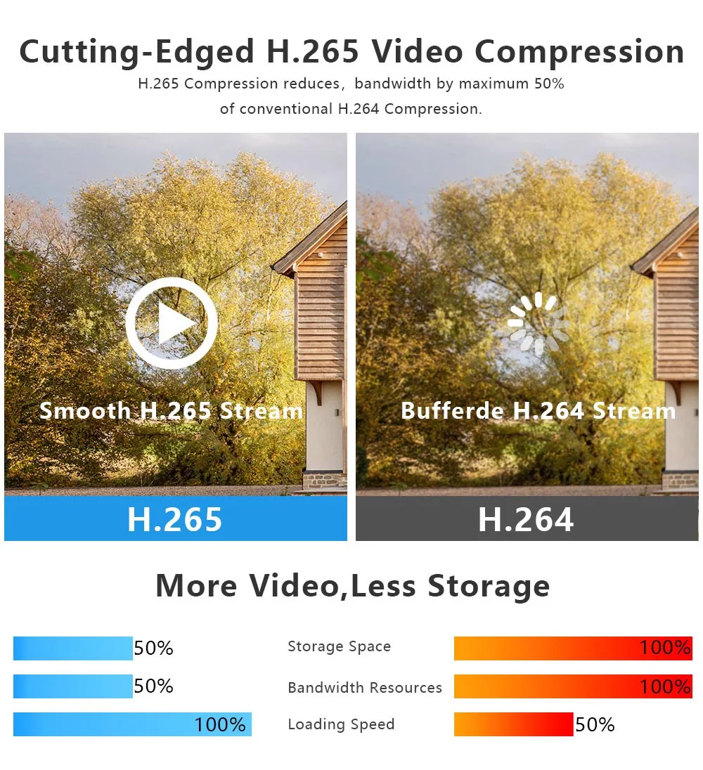 - Стиснення відео H.265: Технологія стиснення H.265 дозволяє зберігати більше даних на жорсткому диску без втрати якості, а також підтримує хмарне сховище.